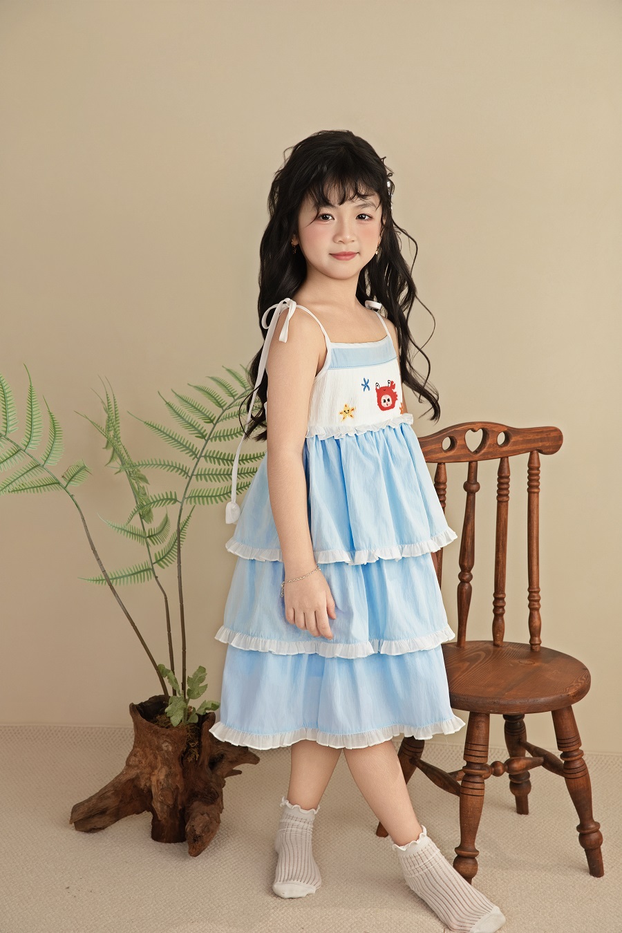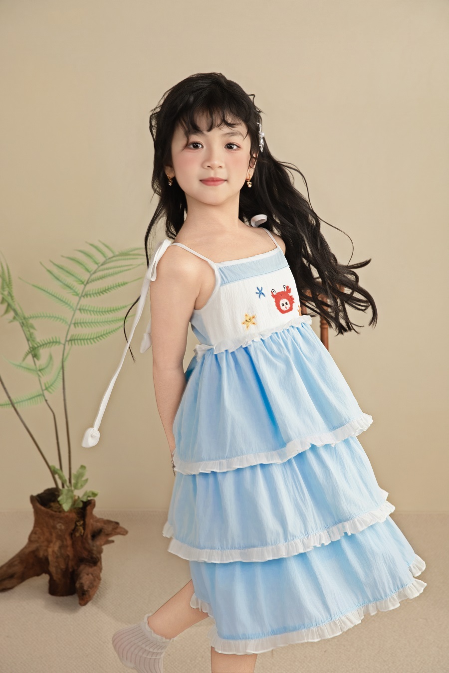 Đầm xanh pastel dáng 3 tầng, điểm xuyết viền bèo trắng nhẹ nhàng, may từ vải cotton cao cấp 2 lớp – mềm mịn, thoáng mát, an toàn cho làn da bé.