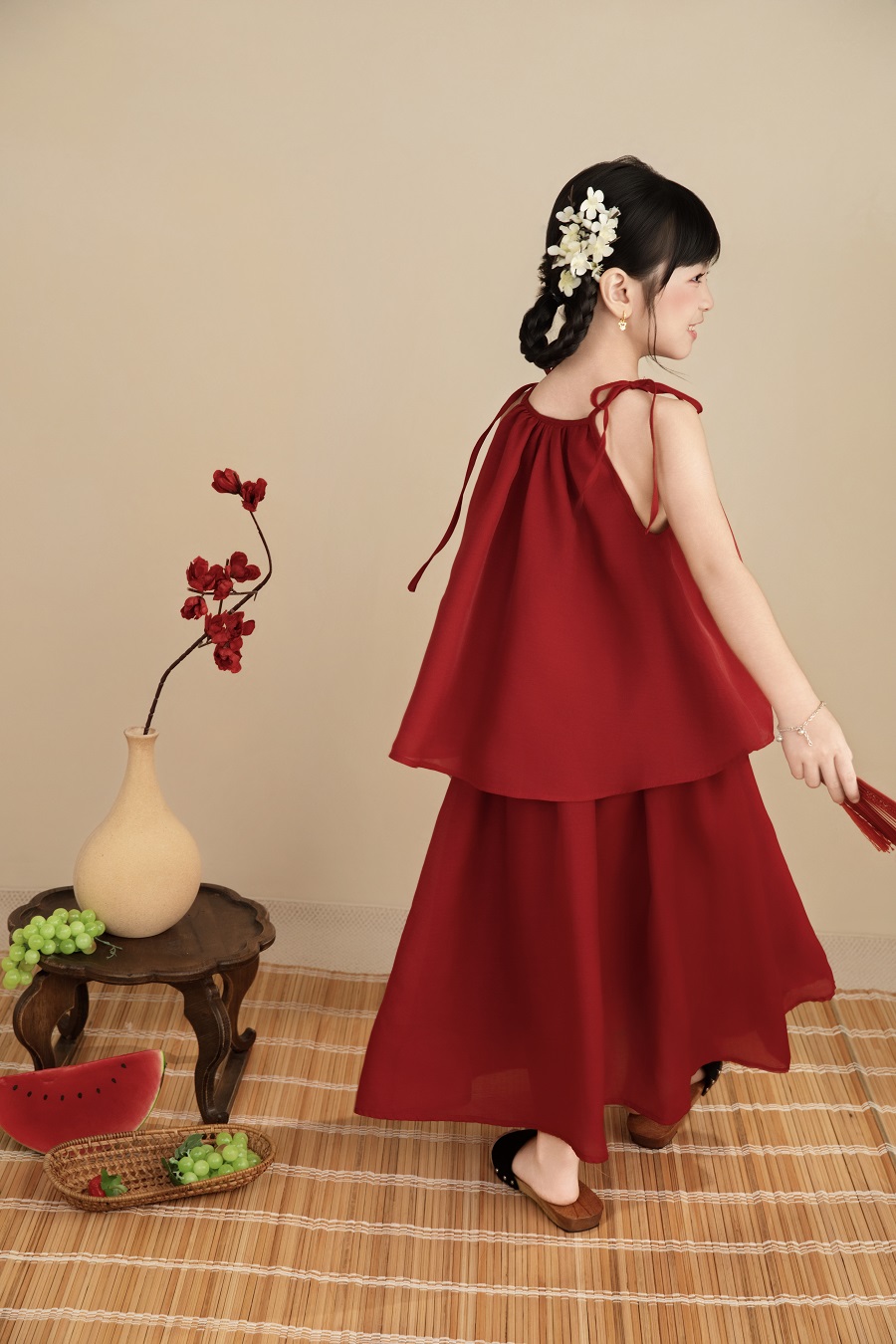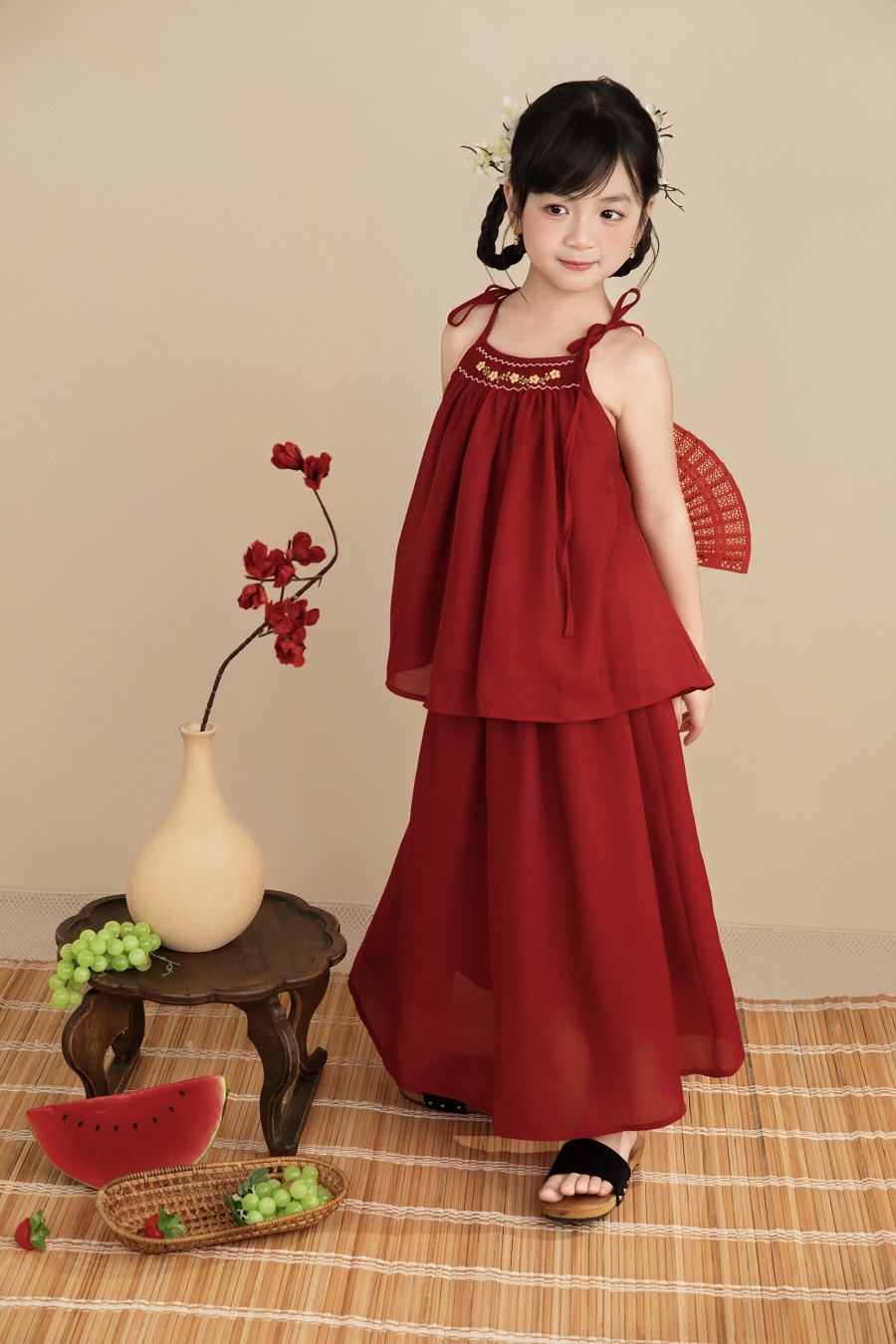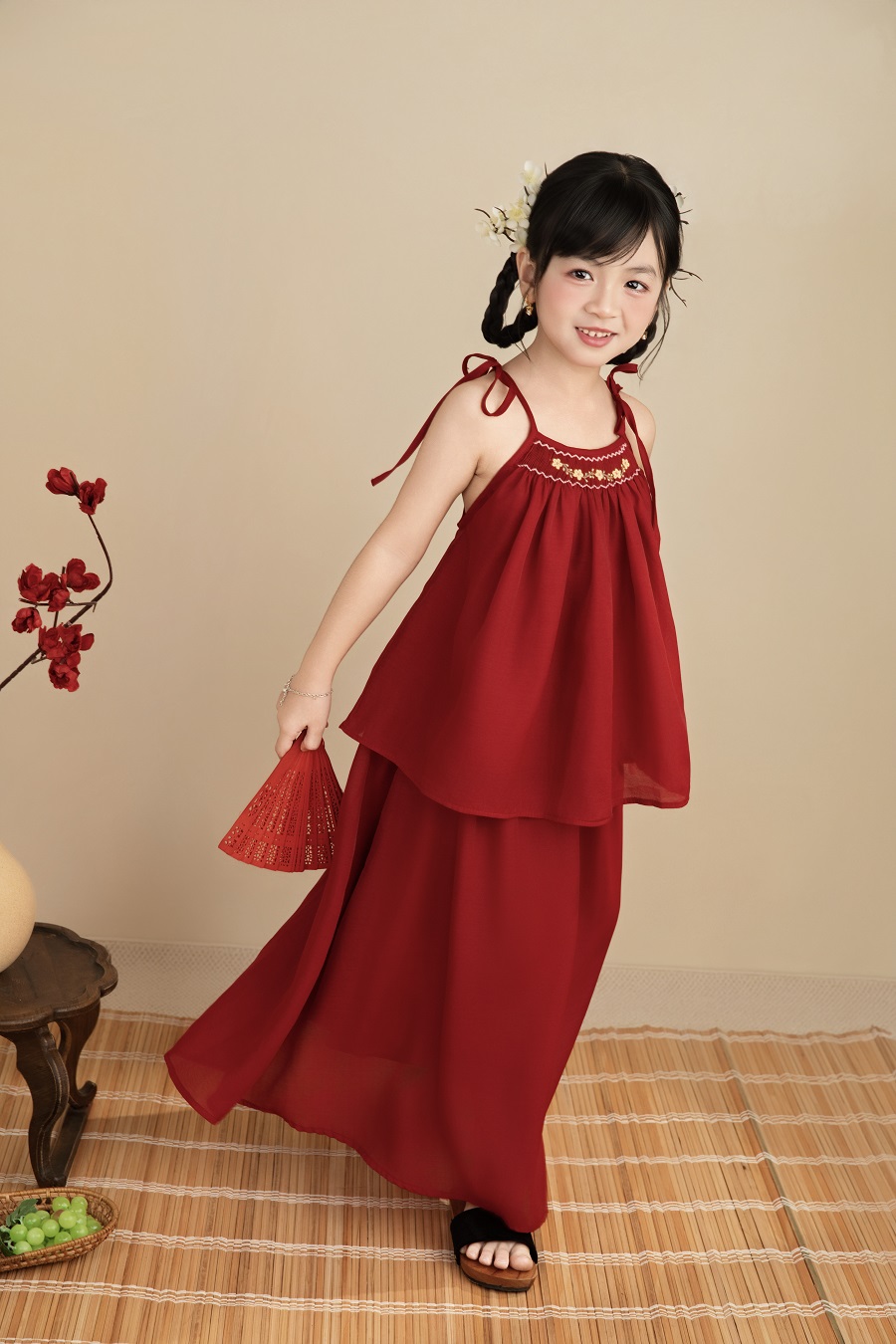 Set áo + chân váy đỏ 2 dây smock thêu tay hoa mai thủ công